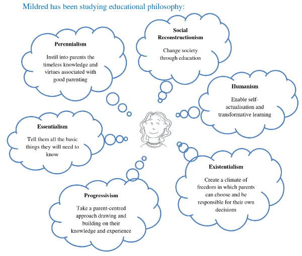 What Mildred actually finds - the course that is most prevalent in antenatal education today - is the compact, ‘urban block, one-size-fits-all course’. She finds it has gone all out to adopt an Essentialism philosophy.