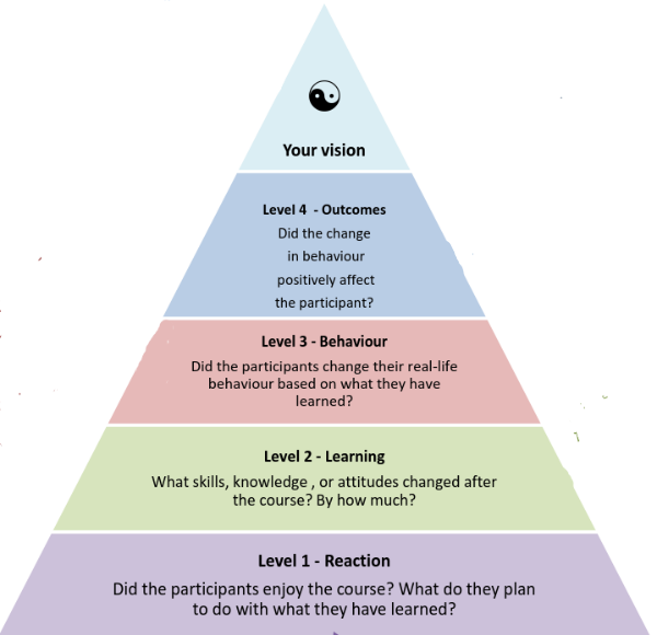 There is a peak (a point) to the 4 levels. It is not a fifth level but ‘an intention’ for what the educational provider hopes she might see over time if a course is evaluated well at all four levels. For example, she might notice that women who attend the course: are more likely to have a positive experience of birth; continue breastfeeding for as long as they had hoped; or report lower levels of postnatal unhappiness.